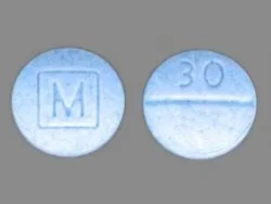 M 30 ist eine spezielle Formulierung von Oxycodon, einem starken Schmerzmittel zur Behandlung mittelschwerer bis starker Schmerzen. Der Aufdruck „M 30“ zeigt die Dosierungsstärke und die Formulierung an. Diese Tablette ist hellblau und trägt auf der Vorderseite ein M und auf der Rückseite die Zahl 30.